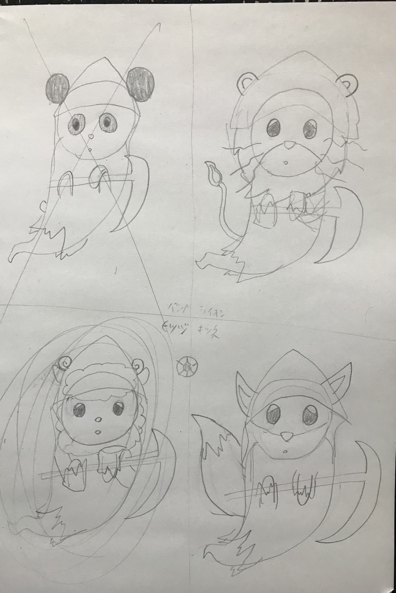 最初はかわいい死神オバケを描こうと思っていて、黒いフードに大鎌というステレオタイプな死神のデザインにぴったり合いそうな動物の候補としてパンダ、ライオン、狐、そして羊の4匹を挙げていました。