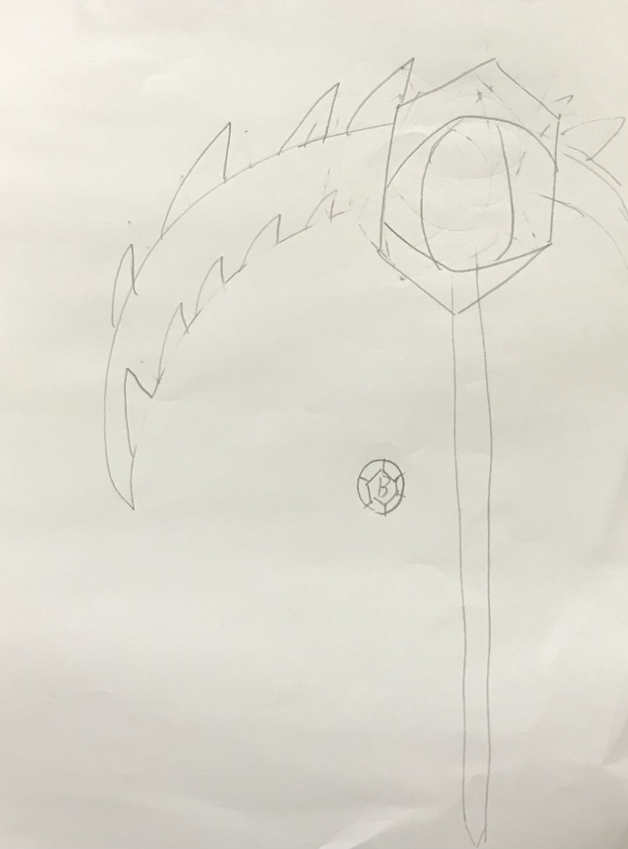 相手の魂を刈り取るために持ち歩いている大鎌も、目やトゲを付けて、あまりゴチャゴチャさせずシンプルにかっこよくしました。